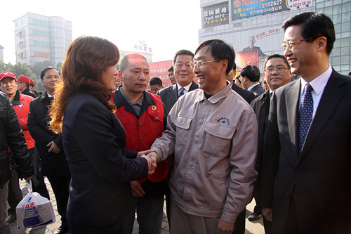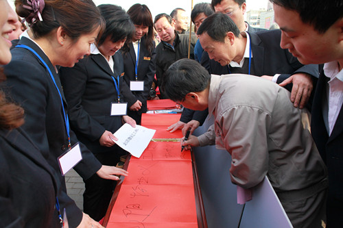 3月3日上午,“當(dāng)代雷鋒”郭明義來到馬鞍山,為郭明義愛心團隊馬鞍山分隊授旗。盡管行程很緊湊,但郭明義還是給金太陽物業(yè)公司義工社題字,并與董事長朱曉梅親切交談,表示應(yīng)當(dāng)將“當(dāng)代雷鋒”精神在鋼城繼續(xù),在金太陽物業(yè)公司義工社繼續(xù)。金太陽物業(yè)公司義工社參與“郭明義愛心團隊”授旗儀式