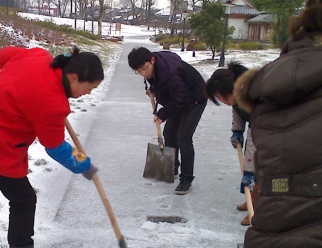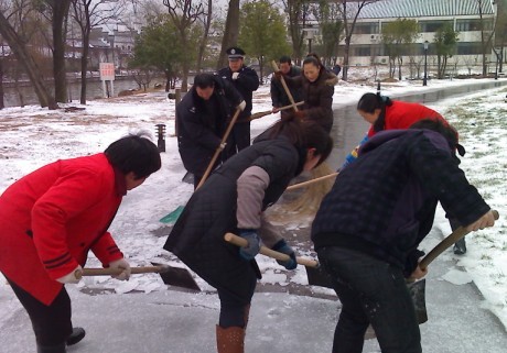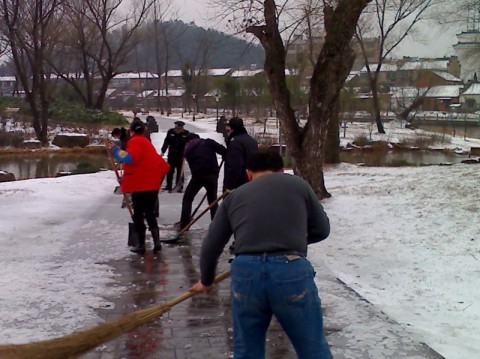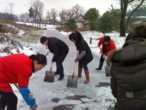 雖然每當(dāng)大雪覆蓋,公司也有嚴明的經(jīng)律,各管理處必須第一時間將所在管理處的門前和通道清理干凈,各管理處還是在完成好自己職責(zé)的情況下抽調(diào)精兵強將,保證重點、全力以赴。公司在短短的2 個小時時間里調(diào)集23名員工,下午1點及時趕赴采石風(fēng)景區(qū)翠螺灣。在細雨薄霧中,經(jīng)過4 個小時的緊張戰(zhàn)斗,3000多米的游道終于掀起神秘的面紗,一條清晰的道路展現(xiàn)出來!受到風(fēng)景區(qū)領(lǐng)導(dǎo)的一致好評!