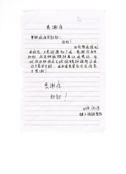 這是一封簡單,可以說是非常質(zhì)樸的感謝信。但其中卻包含了失主對(duì)于我們辛勤工作的安保人員乃至是對(duì)所有金太陽職工的精神的肯定和贊揚(yáng)。我們將會(huì)秉持金太…