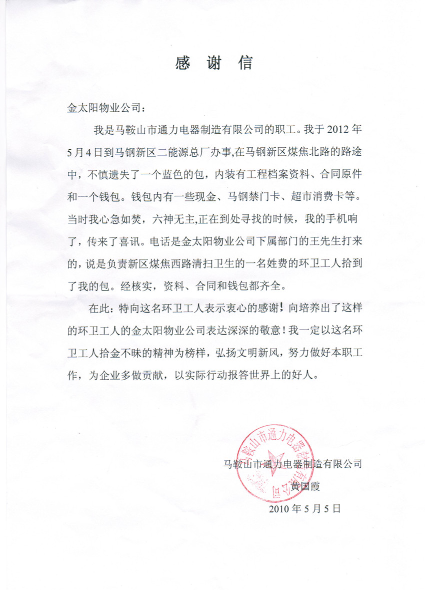 金太陽物業(yè)公司環(huán)衛(wèi)工人拾金不昧,失主特發(fā)來感謝信!